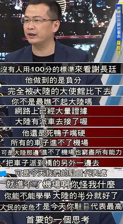 马办前秘书长罗智强也一语中的地指出——谢长廷做到的根本是负分!更直言,谢长廷这次被“最瞧不起的大陆”完全比下去了,“你能学到大陆的半分就好”!