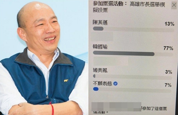 这个名叫“爆料公社”的脸谱网帐号,7日晚间在网络上举行模拟投票活动。结果出炉后,高雄的模拟选情成为大家关注的焦点,“卖菜郎”国民党高雄市长参选人韩国瑜竟以77%得票率大胜陈其迈13%。