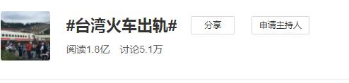 与此同时,大陆网友对此事件也高度关注,#台湾火车出轨#话题更在第一时间登上热搜,截止发稿时,该话题阅读量已达1.8亿次、被讨论5.1万次。
