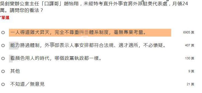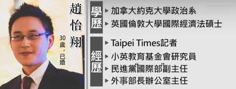 另一曾当过“政治组长”的前“驻美代表”沈吕巡直言,1993年他任此职时,已在外事部门工作戮力了11年,而一般外事官有些就算做了11年都还不一定能出任“政治组长”这样的职务,“请问赵怡翔在外事部几年?这个任命对基层同仁很不公平”。