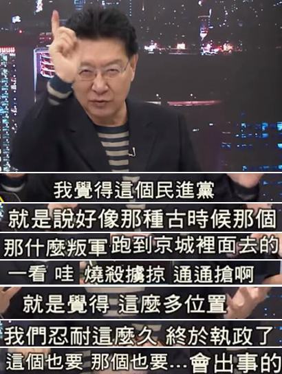 政论节目主持人赵少康忍不住嘲讽完全执政后的民进党当局“像古时候叛军进京似得,烧杀掳掠,统统都抢”,更警告蔡当局“会出事的”!