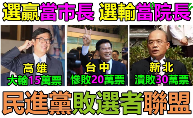 按道理讲,故事进行到这里,随着林佳龙的卸任,山手线这事儿也就了了。不过没想到,在“九合一”选举大败之后,没演够的蔡英文立即推出了“九合一”第二季——败选者联盟。在新北、台中、高雄选输的苏贞昌、林佳龙、陈其迈纷纷上位。