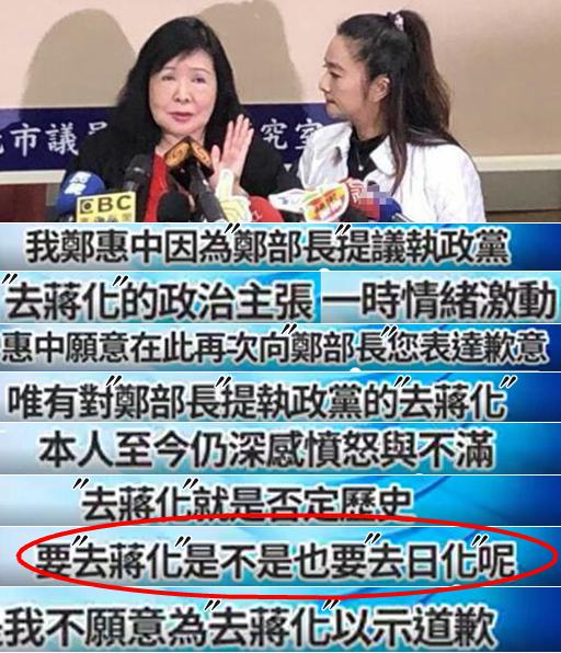中心思想就是:自己打人这个“行为”不对,向郑丽君致歉,但“动机”没毛病,而且特意强调不会为“去蒋化”道歉,并直言“要‘去蒋化’是不是也要‘去日化’?”她认为“去蒋”不是台湾人民共识,郑丽君身为“文化部长”却未倾听人民意见,推动“去蒋化”是撕裂台湾人民情感。