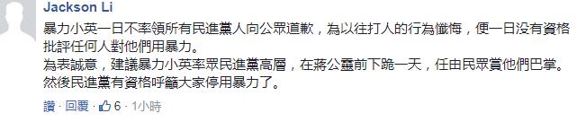 “从民进党邱议莹掌掴李庆华、管碧玲掌掴洪秀柱、苏震清锁喉陈宜民、黄伟哲砸伤吴育升、林淑芬砸伤吴成典、王定宇推倒张铭清等事中,蔡英文便已获得‘暴力小英’的称号”,新党籍台北市议员侯汉廷,在民进党团联手全力谴责暴力时,狠狠打脸对方,“他们以为,暴力应是民进党的专利”!