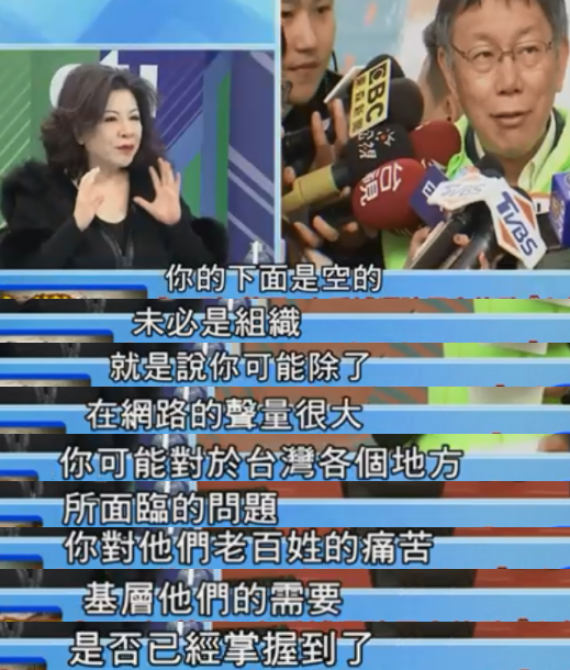 为什么陈思宇会如此惨败呢?一方面跟她中二版的“七伤拳”打法有关;但另一方面,也显示了柯文哲战力上的弱点和“死穴”——欠缺基层组织。这不是撩叔说的,这是柯文哲自我分析。