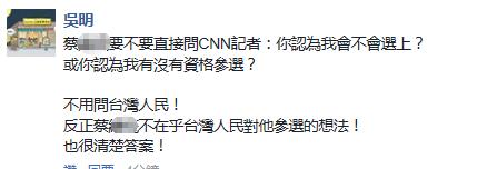 日前,蔡英文在专机上接受美国有线电视新闻网(CNN)独家专访时,明确表态将参加2020的竞选,还对着美国记者表决心称“有信心胜选”。