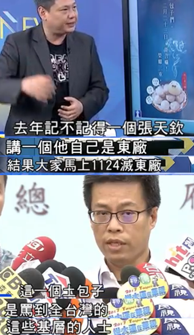媒体人谢寒冰在节目中表示,去年“九合一”选举,民进党当局出了个“东厂厂公”张天钦,今天出了个黄重谚,一句话几乎骂遍了台湾所有基层人士。张天钦也算有了接班人。