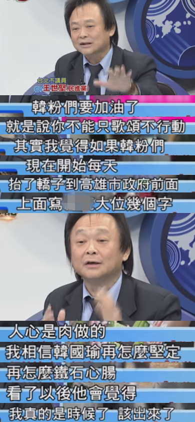 王世坚呼吁,“韩粉”们不要只动口不动手,要抬着轿子,天天去高雄市政府门前求韩国瑜站出来,这样就会感动韩国瑜。