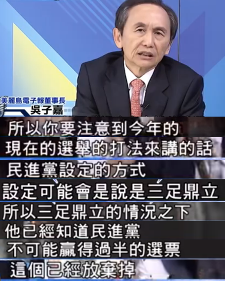 前一阵子,因为猛烈炮轰蔡英文和陈菊施政而被开除民进党党籍的吴子嘉在政论节目中分析,民进党对2020选举的设定是“三足鼎立”,哪三足呢?国民党、民进党以及柯文哲。