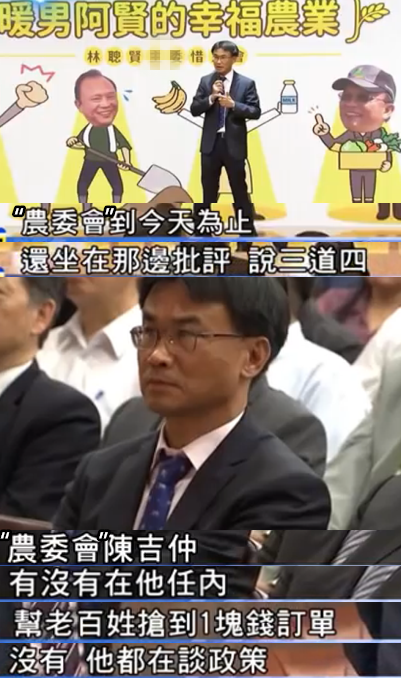 吴子嘉在节目中表示,当韩国瑜在拼命推销高雄的农渔产品时,民进党当局主管农业事务的“农委会”却在拼命扯后腿,而“农委会”自己却没有为台湾老百姓拿到1分钱的订单。