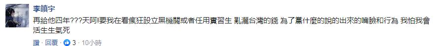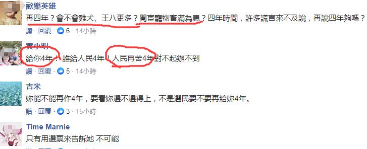 而对于蔡英文“再给我4年,台湾一定脱胎换骨”的说法,更是点燃了广大台湾网友的怒火!“再4年,会不会鸡犬、王八更多”、“再给你4年,人民再苦4年”、“再给你一任,台湾死一半”、“再给她4年,要我看疯狂设立黑机关或者任用实习生?我怕我会活活气死”……