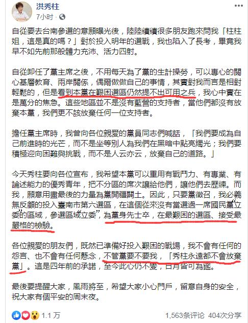 而对于参战台南的意念,“柱柱姐”先是于9日凌晨,在脸谱网上发文做了详尽的解释,直言艰困选区并不是没有蓝营支持者,当他们没有放弃本党时,国民党更不该放弃任何一位支持者,并称自己“愿意用尽最后的力量为党开疆辟土”、“在最艰困的选区、接受最严格的检验”。