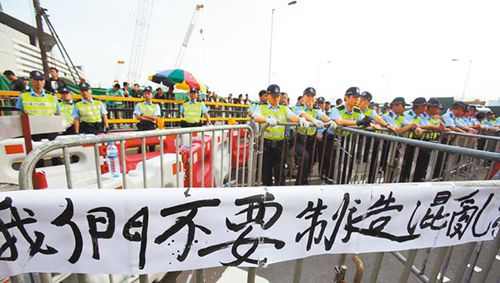 10月1日,占中人士汇集金紫荆广场外围,有民众拉起“我们不要制造混乱”的布条。