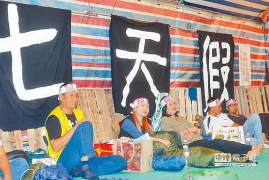 劳团成员以绝食静坐方式,盼民进党“立院”党团能主动撤案。(图片来源:台湾《中时电子报》)