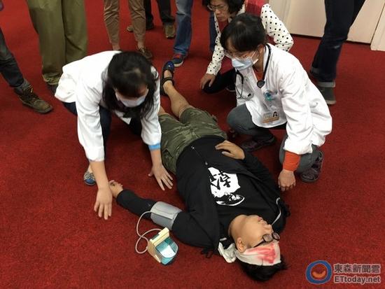 台湾“东森新闻云”报道指出,台“立院”当月16日召开“劳基法修法”公听会,民进党、国民党、“时代力量”与亲民党“立院”党团总共邀了28名代表进场,会议现场气氛火爆,并发生推挤冲突,已绝食288小时的劳团代表许惟栋不支倒地,随后被送往台大医院。