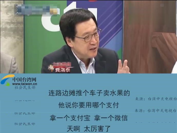 国民党籍“立委”费鸿泰在台湾节目中表示,来到大陆发现路边推车卖水果的都用微信、支付宝支付,直呼“天啊,太厉害了”。