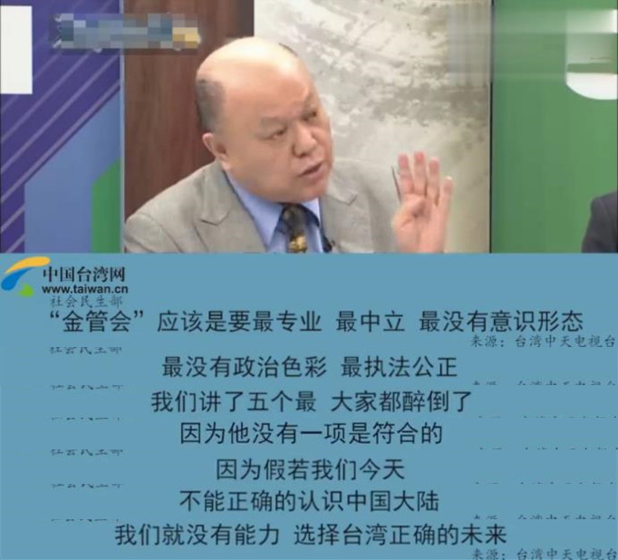 台湾政治评论员李胜峰说道,“金管会”应该是最专业、最中立、最没有意识形态、最没有政治色彩、最执法公正的了,讲了五个最大家都醉倒了,因为他没有一项是符合的。