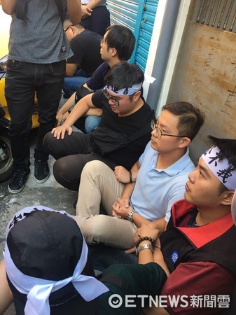 国民党青年党工阻挡“执行署”查封党工宿舍。(图片来源:台湾“东森新闻云”)