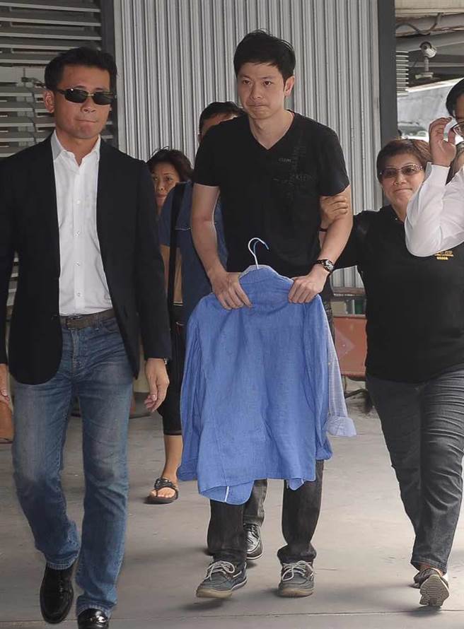 李新的儿子李柏毅带着他的衣衫进入殡仪馆。(图片来源:台湾“中时电子报”)
