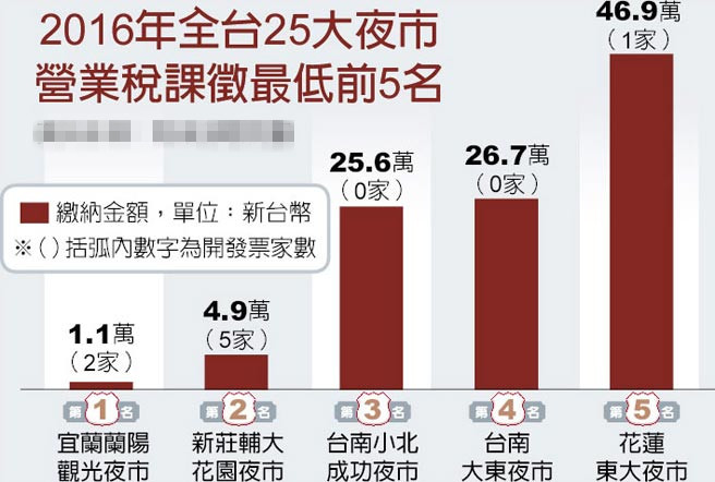 2016年全台25大夜市营业税课征最低前5名。(图片来源:台湾《中国时报》)