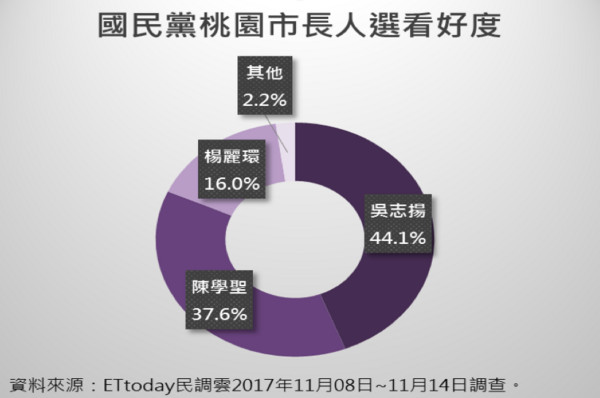 桃园市长方面,吴志扬曾任桃园县长,2014年代表国民党参选桃园市长时,败给民进党阵营的郑文灿。据台湾“中时电子报”报道,桃园市议会9月份进行2018桃园市长问卷调查,了解选前1年民众对于桃园市长人选的意见,共发出1万份抽样。7位可能参与桃园市长人选,暂以吴志扬、陈学圣、鲁明哲领先,吴志扬为现任“立委”也是前任县长。选民认为吴与郑文灿竞选的机率较高。