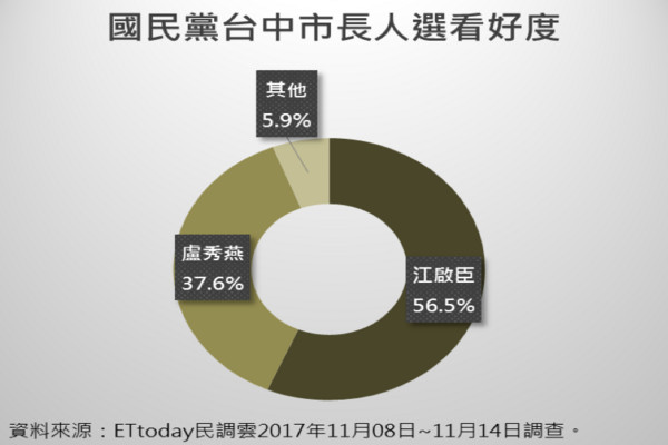 在竞争对手部分,卢秀燕的民调支持度暂时领先江启臣8%;但在看好度部分,江启臣则是略高卢秀燕约2%。学经历部分,有52%民众认为江启臣比较符合市民对市长身份的期待,卢秀燕则只有34.51%。在竞选对战支持度部分,江启臣以46.3%,胜过林佳龙的30.37%,卢秀燕则以46.43%胜过林佳龙的29.71%。