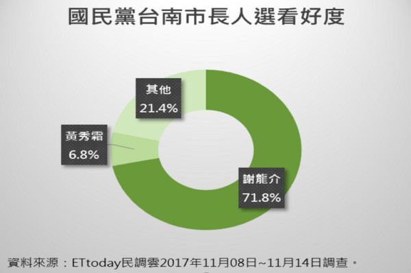 台南市候选人中,现任市议员谢龙介(71.8%)受网友看好,上届参选落败的黄秀霜看好度仅6.8%。交叉分析显示,谢龙介不论在哪个族群的看好度都大幅领先黄秀霜。