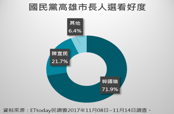 高雄市以现任国民党高雄市党部主委韩国瑜(71.9%)民调最高,网友最看好其出面挑战高雄市长宝座,而现任不分区“立委”陈宜民的看好度为21.7%,且不论在男性或女性均获7成2左右的看好度,大幅胜过陈宜民。年龄方面,韩国瑜不论在哪个族群的看好度都大幅领先陈宜民。