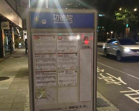 台当局“行政院”公交车站牌遭人改名为“功德院”。(图片来源:台湾“东森新闻云”)