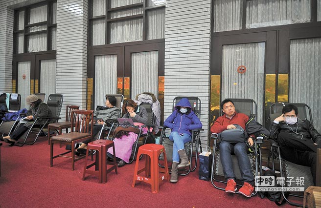 民进党“立法院”党团为确保能抢先送案,防止在野党的案海攻势,“绿委”们冒着寒流在“立法院”议场门口轮班排队。(图片来源:台湾《中时电子报》)