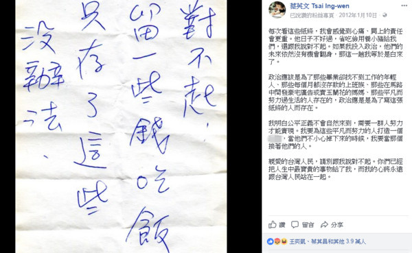 据“东森新闻云”报道,6年前的今天,蔡英文第一次竞选台湾地区领导人时,在脸谱网上发出“小猪扑满”(民进党为竞选推出的募款方式)支持者的纸条,上头写着“没办法,只存了这些,留一些钱吃饭,对不起”,让蔡英文感性直言,“我会感觉到心痛”,老百姓虽然日子不好过,却是省吃俭用养“小猪”,还说对不起,“如果我投入政治,他们的未来依然没有机会翻身,那这一趟我等于是白来了。”