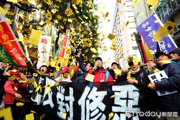 “劳基法”修正案通过后,场外劳团绕行“立法院”。(图片来源:台湾“东森新闻云”)