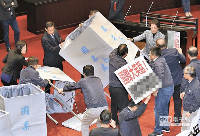 投票前,国民党“立委”抗议并将圈票处推倒。(图片来源:台湾《中时电子报》)