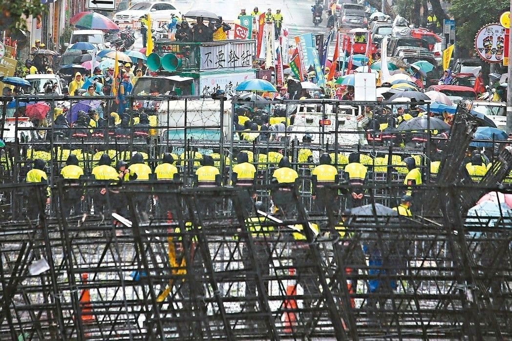 劳工与学生团体23日举行反“劳基法”修恶大游行,在“行政院”前静坐的游行群众,晚间再度与警方爆发肢体冲突。(图片来源:台湾《中时电子报》)
