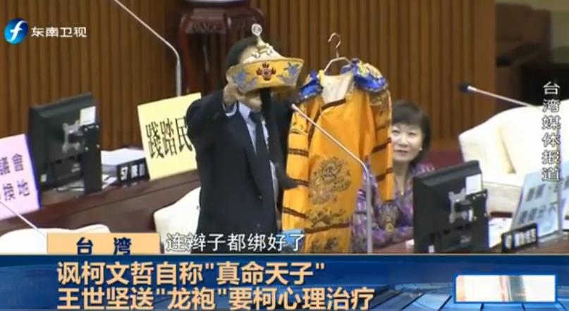 王世坚送柯文哲龙袍。(图片截取自东南卫视视频)