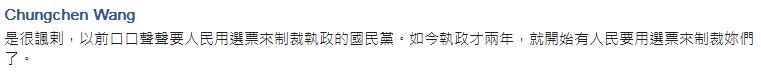 另一方面,像是“劳基法”修恶,让劳工难脱过劳恐惧;眼高手低的长照2.0,让人民担心老年生活;电厂火力全开让全台陷于空污恐慌等等,都是让人民痛苦的施政。这些民生问题历历指证执政党施政不当、引起民怨,但蔡当局却将责任归咎于国民党,无疑是推诿卸责、转移焦点。请蔡英文搞清楚,是人民不满民进党施政,才要用选票教训民进党。