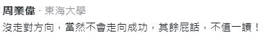蔡英文此言一出即遭到台湾网友痛批“自我安慰,阿Q想法,今年就是去不了,明年后年应该也去不了。”“文青读稿机,再度发挥自慰精神。”“选一个败家的来搞垮台湾”“讲的全是屁话!”