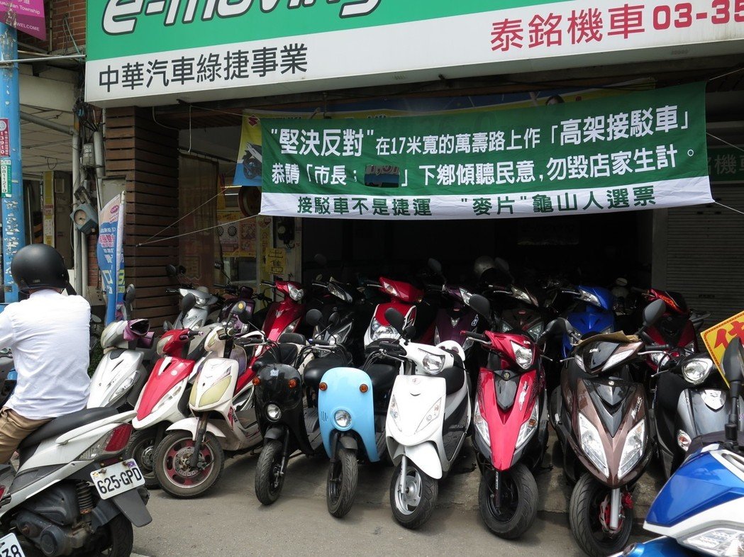桃园捷运棕线高架化争议,近日有商家串连拉起布条反对。(图片来源:台湾《联合报》)