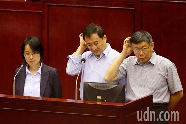 针对北农是否送洋酒给民进党台北市党部,北农总经理吴音宁(左起)、董事长陈景峻与市长柯文哲下午在台北市议会接受质询,吴音宁明确表示,没有。(图片来源:台湾《联合报》)