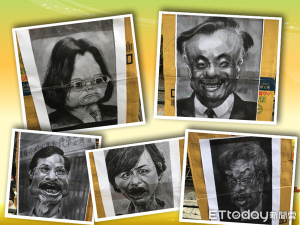 八百壮士号召群众到“立法院”外抗议,并列出年改“5大恶人”扭曲肖像。(图片来源:台湾“东森新闻云”)