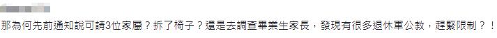 如果你以为蔡当局今年因“毕业典礼”闹出的争议只是让小学生停课这一件,那就out了。据“联合新闻网”报道,有不少家长抗议,校方原本通知1名毕业生可以带3名家属去参加典礼,却突然在16日临时修改通知,变成只有1名家属,“不能亲自看到孩子领到毕业证书很无奈”。台防务部门对此紧急澄清,家长人数限制是因为座位有限,特意强调与蔡英文到场与否无关。