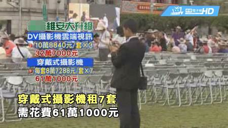 据报道,1套10万(新台币,下同)多的DV摄影云端视讯服务预计租借3套,共需花费32万7000元。穿戴式摄影机每套8万7288元要租7套,花费61万1000元。其他网路传输设备加上电源扩充模组,总计需花费100万元。