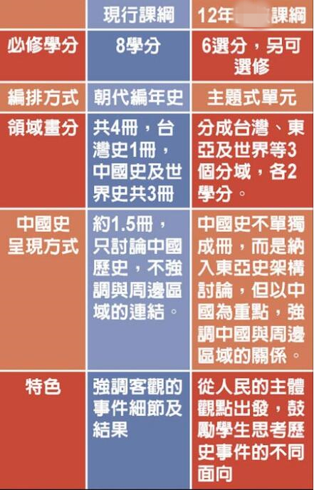 台湾现行的高中历史课纲分成台湾史、中国史及世界史等3部分,明年上路的12年义务教育课纲(即新课纲)则改为台湾史、东亚史及世界史,将“中国史纳入东亚史的架构下讨论”,中国史不再单独存在。