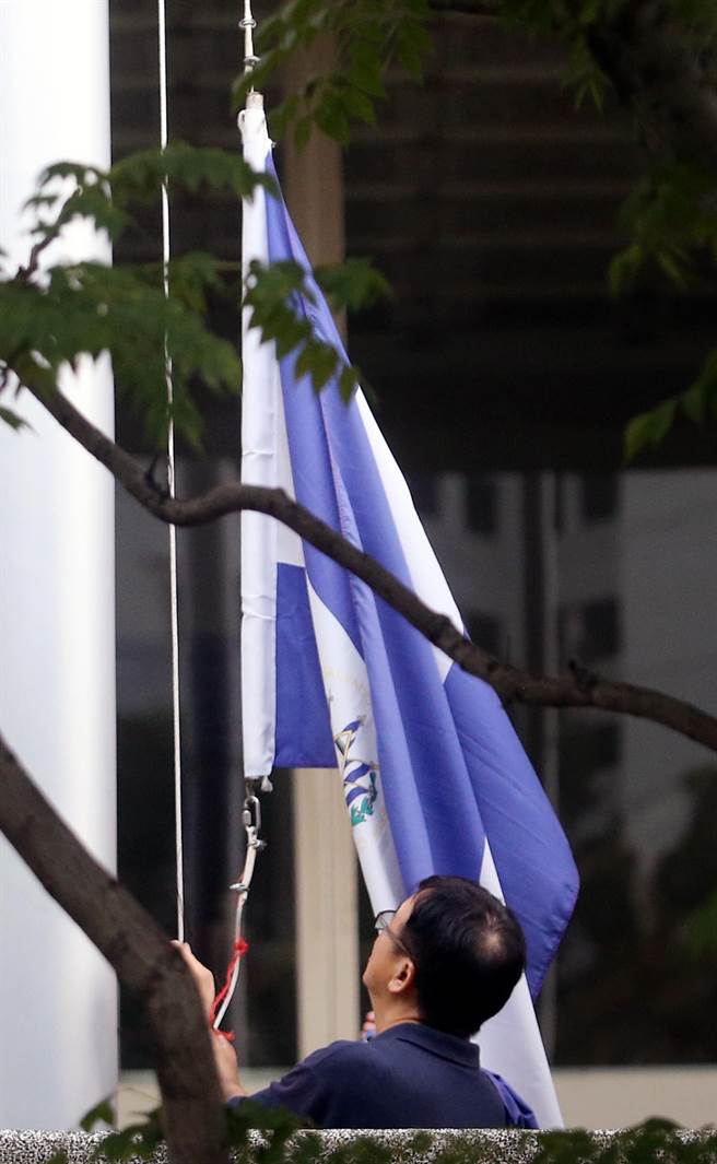 萨尔瓦多21日与台“断交”,驻台使馆人员一早降下国旗。(图片来源:台湾《中时电子报》)