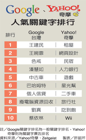 而另一大网络搜寻引擎Google发布的11月台湾网友一般关键词广告排行榜,前十名几乎都是王建民、王婉霏、色戒、潘慧如、蔡依林等影视、体育话题人物。不过“中古车”也名列第五名,可见民众对于中古车兴趣浓厚。