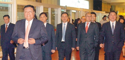 大陆地产富豪访问团昨(21)日下午抵达桃园机场。图为访问团召集人凤凰卫视行政总裁刘长乐(前),带领访问团成员雅乐居地产执行长陈卓贤(第二排左起)、广州富力地产董事局主席李思廉、棕榈泉董事局主席曾伟、北京万通地产董事局主席冯仑、建业地产董事长胡葆森等人走进大厅。台湾《经济日报》记者陈嘉宁摄