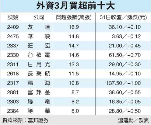 外资3月前十名的买超标的集中面板、半导体,其中以友达买超16.9万张居冠。摩根士丹利科技产业分析师王安亚,高喊友达董监改选行情启动。友达融券余额已从1月下旬高峰的2.3万多张,降到昨天的6800多张。王安亚认为,友达在2001年、2004年、2007年分别改选董监,当年股价都有20%至50%的涨幅,今年友达的改选行情同样值得期待;此番论点吸引外资买盘先行卡位。