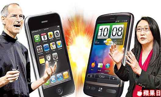 宏达电控苹果侵犯五项专利。右为宏达电董事长王雪红,左为苹果执行长乔布斯。图片来源:台湾《苹果日报》
