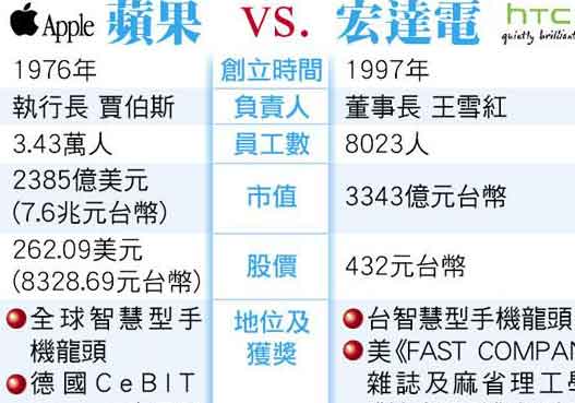 报道指出,苹果公司目前市值为宏达电的23倍,这起控诉俨然小虾米对大鲸鱼的专利权大战!台当局“经济部知识财产局局长”王美花昨指此案具“重大指标意义”,宏达电这一步全世界都在看。