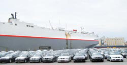拜经济景气复苏所赐,台中港进口车数量屡创新高!利比里亚籍“地球精灵号”,20日载来849辆价值新台币26亿元奔驰、BMW及保时捷高级进口车抢滩。台中港务局预估今年进口名车约达8千辆,5月份累计达1千7百多辆,创开港34年来单月新高。图片来源:台湾《中国时报》